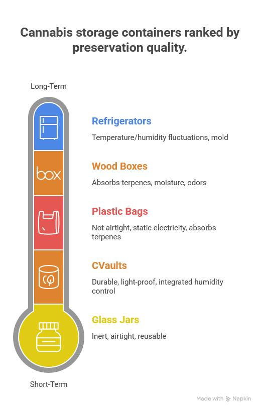 • Plastic Bags (especially Ziploc): These are not truly airtight, can generate static electricity that pulls trichomes off the flower, and can absorb terpenes over time. They offer minimal protection against light and air.